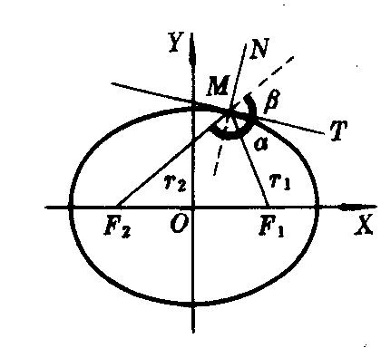 ![]() 椭圆的切线和法线的性质:椭圆的切线和过切点的两焦点半径所成的角相等,而法线平分两焦点半径所成的角(如图1). 由此可知,椭圆的光学性质是:将椭圆绕其长轴旋转一周生成旋转椭圆面,在一个焦点发出的光线投射到曲面上,经过曲面反射后都通过另一个焦点(如图2).电影放映机的聚光灯的反射镜面、激光发生器的反射镜面都应用了这一性质.