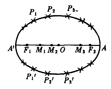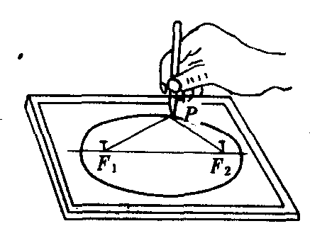 拉线法 ❶取定长为2a的绳子,将它的两端固定在长度为2c的线段F1F2的两端点F1和F2处; ❷用笔尖把绳子拉紧,并在纸上连续移动,就可画出椭圆(如图1).交弧法 ❶作长度为2c的线段F1F2,取F1F2的中点O,分别在OF1和OF2的延长线上取点A′和A,使|OA′|=|OA|=a; ❷在线段A′A上任取一点M1,分别以F1和F2为圆心,以A′M1和AM1为半径画弧,交于点P1和P1′,改变M1点的位置,在A′A上取点M2,M3,…,用相同的方法画弧,得出交点P2,P2′,P3,P3′,…; ❸将A′,P1,P2,P3,…,A,P3′,P2′,P1′,A′顺次连结成一条光滑的封闭曲线,就是求作的椭圆(如图2).