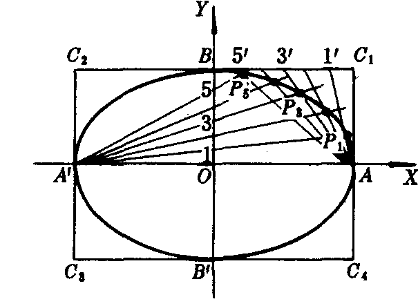 图2 矩形法 ❶以C1(a,b),C2 (-a,b),C3 (-a,-b),C4(a,-b)为顶点作矩形C1C2C3C4,矩形的四边和两坐标轴分别交于A′,A和B′,B; ❷将C1B和OB都n等分(如图3中n=6),分点分别是1,2,3,4,5和1′,2′,3′,4′,5′; ❸连结A1′和A′1,A2′和A′2,A3′和A′3,A4′和A′4,A5′和A′5,P1,P2,P3,P4,P5分别是它们的交点; ❹用光滑的曲线把A,P1,P2,P3