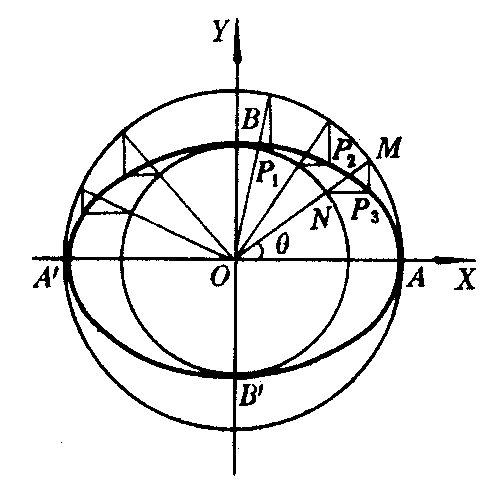 图3 辅助圆法 ❶分别以a和b (a>b)为半径,以原点O为圆心作两个同心圆; ❷作半径交大圆于M、交小圆于N,自M和N分别作X轴和Y轴的垂线,两垂线相交于P1,用同样的方法作一系列的点P2,P3, …, ❸把P1,P2,P3,…以及大圆和X轴的交点A′和A,小圆和Y轴的交点B′和B连结成一条光滑的封闭曲线,就是椭圆 =1 (如图4).