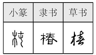 【提示】木,中间是竖,不是竖钩; 位于字左时,末笔的捺改点。右下的日,中间一横宋体与两边相接,楷体与左边相接,与右边相离。 *椿chūn13画 木部 木名,通称香椿。落叶乔木。羽状复叶,花白色,果实椭圆形。嫩叶有香味,可吃。有时也指臭椿,外形与香椿一样,但叶子有特殊气味,不能吃。 椿chūn中古形声字。从木,春声。植物名,落叶乔木。香椿叶可吃。臭椿叶子有臭味。木材不坚固。 椿杶◎次★常