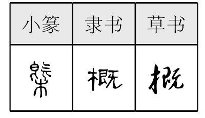 【提示】木,中间是竖,不是竖钩; 位于字左时,末笔捺改点。 既, 左为 ; 旧字形左边是皀或 。 右边的 , 第二笔是竖折, 不是一竖、一横两笔。 *概〔槩〕gài13画 木部 (1) 气度;神情: 气~。 (2) 〈书〉 景象;状况: 胜~(优美的景色)。 (3) 大略: ~况|~述|大~|梗~。 (4) 副词。相当于“一律”: 一~|~不负责。 概 ☚ 杵 杯 ☛ 概㮣gài古代形声字。从木,既声。小篆汉隶木在下,既在上。音转如己改例。本义是量谷物时刮平斗斛(hú)的器具。中古以后偏旁左右排列作“概”,现以为规范字,上下结构的作异体字。见《异体字表》。引申为大略,总括。如:概论|大概|不能一概而论。组词如:概念。引申为概况,情况,景象。如:胜概。又引申为气度。如:气概。 概槩★异◎异★常◎常