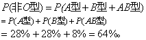 例2 已知某地区人群血型分布的频率: O型为36%,A型为28%,B型为28%,AB型为8%,求该地区某人不是O型的概率。 诸血型构成完备系,故 P(A型)+P(B型)+P(AB型)+P(O型)=28%+28%+8%+36%=1。 因此,按式(4)得