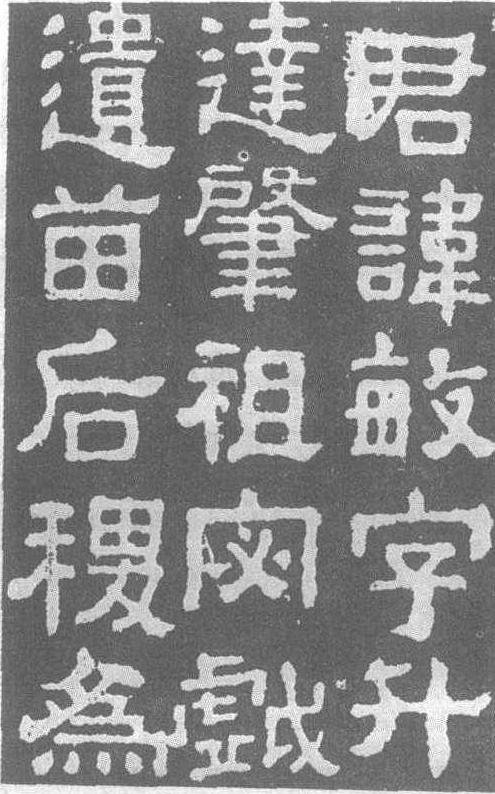 樊敏碑(局部) 亦稱<巴郡太守樊敏碑>。東漢·建安 七 年(202) 刻。隸書二十一行,行二十九字。額篆書題“漢故領校巴郡太守樊府君碑”十二字。清楊守敬《平碑記》曰:“石質粗,鋒芒多殺,無從定其筆法之高下。而一種古穆之氣,終 不 可磨。”見於宋人著録,後遂罕得,至清·道光年間(1821—1850) 乃再訪得,然系重刻,非原石也。清孫承澤稱藏有宋拓本,一字不缺,但實重刻初拓本。碑陰有宋崇寧壬午(1102)邱常題記、紹興己卯 (1159)程勤题記。清徐渭仁(隨軒金石文字)據宋拓雙鈎刻本,最佳。碑在四川雅州蘆山 (今蘆山縣)。 |