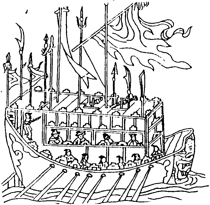 古代大型主力戰船。因建有重樓,故稱。通常爲主帥所居,配備多種兵器,可容兵員數十或數百。春秋吳國已有之。《史記·平準書》:“越欲與漢用船戰逐,乃大修昆明池,列觀環之,治樓船高十餘丈,旗幟加其上,甚壯。”《西京雜記》卷六:“昆明池中有戈船、樓船數百艘。樓船上建褸櫓,戈船上建戈矛。”《通典·兵十三》:“樓船,船上建樓三重,列女牆、戰格,樹幡幟,開弩牕、矛穴,置抛車、壘石、鐵汁,狀如城壘。”宋·陸游《書憤》詩:“樓船夜雪瓜洲渡,鐵馬秋風大散關。”參見本類“大翼”。參閲《漢書·嚴安傳》、宋·曾公亮《武經總要前集·戰船》、明·茅元儀《武備志·戰船》。