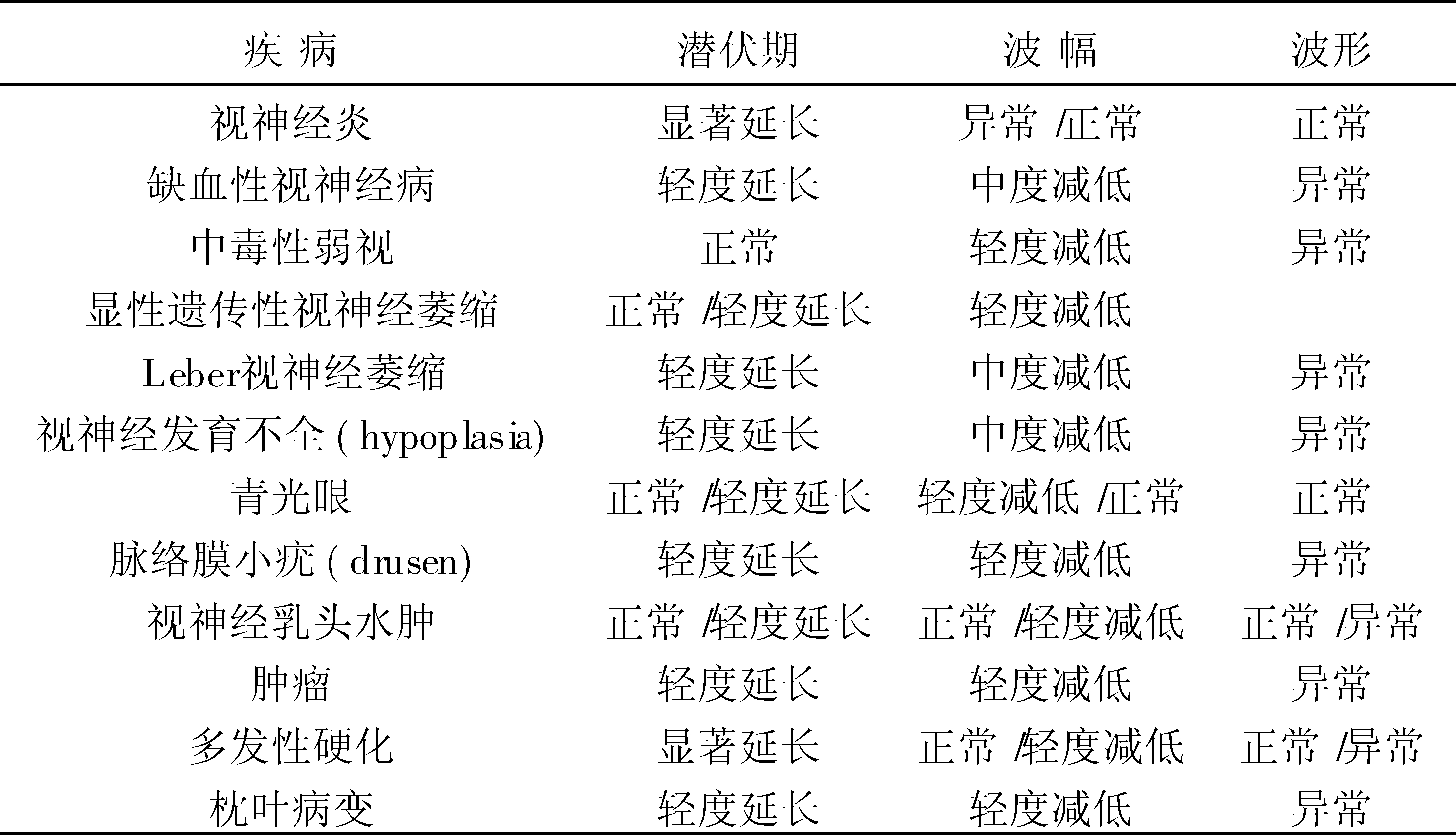 用模式翻转刺激技术诱发的VEP,称模式翻转视觉诱发电位。由NPN三相复合波组成,常根据其各自的平均潜伏期(ms)分别命名为N75、P100和N145。其中P100波为代表波,其波峰潜伏期是临床评价PRVEP最常用的指标。由于PRVEP波形成分简单,容易记录和分析,临床应用广泛,可研究视神经、视交叉、膝状体距状回辐射或枕叶的病变。Sokol S总结了VEP异常在神经眼科和神经病学中的意义,见下表。