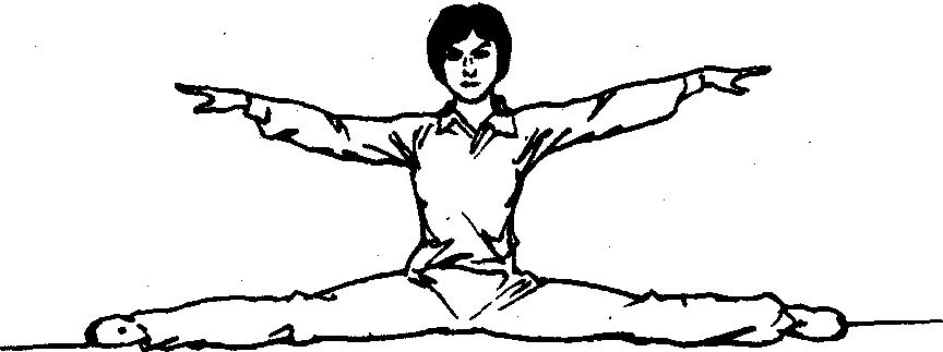 柔韧性练习之一。可提高腿部内侧伸展性。动作要领 两脚平行开立, 并向两侧滑动至两手于体前撑地, 两腿保持在一条直线上, 逐渐做下振动作。当两腿夹角达到最大限度时再停留片刻。教学重点 要求两腿内侧接触地面, 可采用两手正握横木,两腿横叉滑动下压方法,以提高动作质量。
