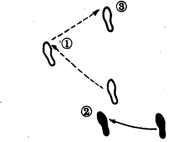 少林地术步法。两腿错步站立,前脚向斜前方上步,后脚随之跟步;前脚向外或内再横移一步。其足迹路线如图。