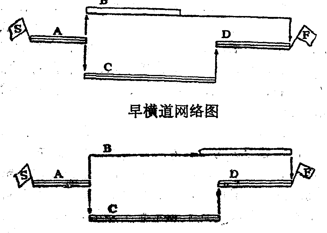 横道网络图单代号时间坐标网络图的一种表现形式,其优点是直观、清晰,不需进行时间参数的计算,容易为人们所接受。所有工作都处于最早可能开始状态下的横道网络图叫早横道网络图; 所有工作都处于最迟必须结束状态下的横道网络图叫迟横道网络图。工作用长方条形表示,方条的长度就是该工作的延续时间,工作间的联系线用水平和垂直的细实线表示,水平线段的长度就是两工作间的时间间隔,用△表示。在早横道网络图中,工作早自由时差等于该工作与其诸紧后工作所形成的时间间隔中的最小值; 在迟横道网络图中,工作迟自由时差等于该工作与其诸紧前工作所形成的时间间隔中的最小值。总时差则需早、迟横道网络图对照来确定,即等于最迟必须开始时间与最早必须开始时间之间的差值。关键线路亦可从图上直接求得: 在早横道网络图中,无水平联系线与网络终点相联的工作为关键工作(用三横线长条表示),凡是只有垂直联系线与关键工作相连的工作必为关键工作,如是逐次向网络始节点点方向推移而找出全部关键工作。在迟横道网络图中,则需从网络始节点开始逐次向网络终节点方向推移,而找出全部关键工作。