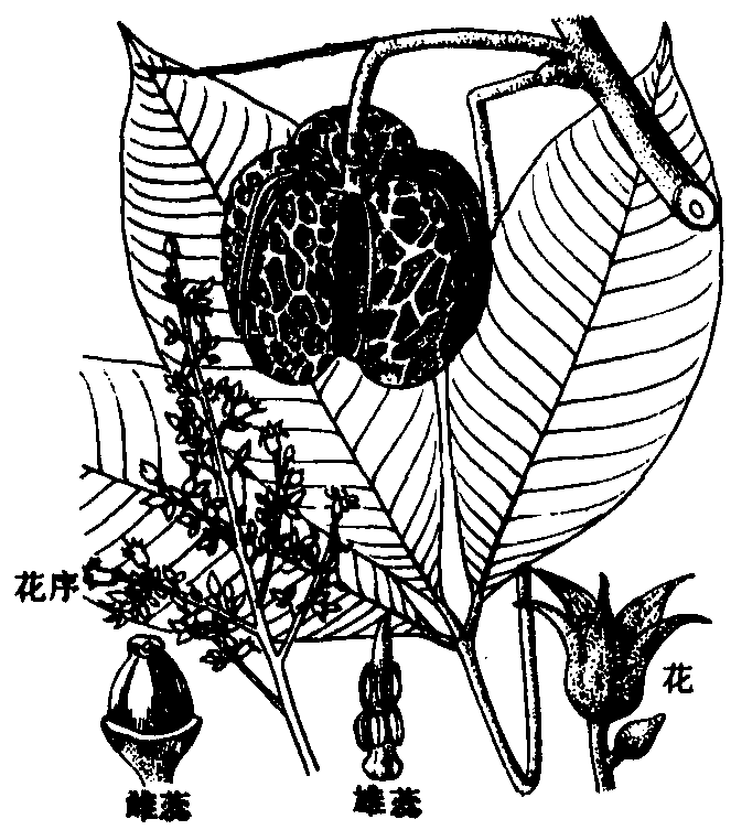 橡胶树 橡胶树大戟科橡胶树属常绿乔木,又称巴西橡胶。约有20种。中国于1904年引入1栽培种。植株高20~40 m,叶互生或近对生,叶柄长,指状3小叶,小叶长椭圆形,长10~35cm,宽4~10cm,先端渐尖,基部楔形。花雌雄同株。花序腋生,长11~16cm,雄花具10枚雄蕊,2轮;雌花子房3~4室,每室1株。蒴果椭圆状球形,径5~6cm,种子长椭圆形,有斑纹,长约3cm,径1~1.5cm,具沟状种脐。花期3~4月,果期6~9月。世界约有37个国家种植,有100多年栽培史。正常生长温度20~30℃,5℃以下受冻害,年降水量应为1500~2500 mm。天然橡胶为重要工业原料,橡胶制品达5万多种。种子含油率为22%~25%,可作工业原料。原产巴西热带雨林中。1904年以来,中国海南,云南、广西南部种植成功。种子1000粒重4000g,实生苗芽接,定植后5~6年割胶,经济寿命15~20年。橡胶是重要工业原料。全属20种,主产热带美洲。中国引入1种。 橡胶树 橡胶树Xiangjiaoshu大戟科。又名三叶胶、巴西橡胶树。常绿乔木,具乳汁。掌状三出复叶,小叶椭圆状披针形;叶柄顶端具2腺体。圆锥花序,花小,无花瓣。蒴果球形,成熟时裂成3果瓣;种子似蓖麻种子,但较大,黄褐色,有斑纹。原产巴西。我国海南、广东、广西、云南、台湾、福建等省南部有大面积栽培,是世界上产胶量最多、质量最好的橡胶植物,橡胶为重要工业原料;种子含油25%,榨油可制肥皂、油漆、尼龙及固化油,经精炼后尚可食用。