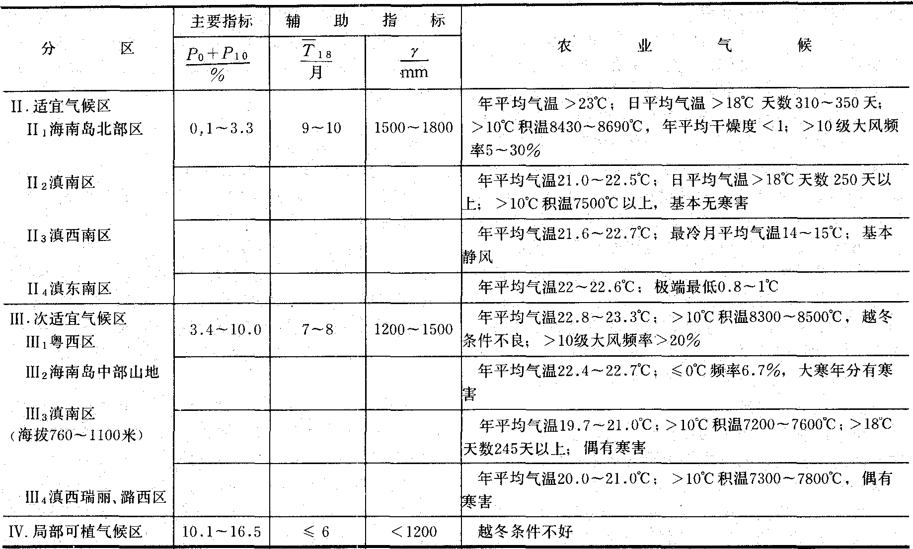 橡胶树气候区划xiangjiaoshu qihou quhuaclimatic divisions for rubber trees根据橡胶树的农业气候指标制定的农业气候区划。 中国橡胶树分布在南起北纬18°14′ (海南岛崖县), 北至25°N(云南保山县的怒江农场)之间。包括广东、云南、广西、福建及台湾省南部, 区划工作只考虑主产地广东、云南南部。以橡胶树低温寒害指标作为划区的主要指标,其中两项具体指标为:❶极端最低气温≤0℃出现机率P0(%); ❷日平均气温≤15℃的阴冷日在20天以上 (两次阴雨天气过程间隔期3~5日), 期内平均气温≤10℃过程的出现机率P 10(%)。以上两种指标如出现一次, 橡胶树严重寒害率即可达30%以上。辅助指标是: 以月平均气温≥18℃的月数亍18作为橡胶树生长期长短的指标, 以年降水量γ作为水分指标。具体区划见表。 中国橡胶树气候区划指标及分区  (续表)