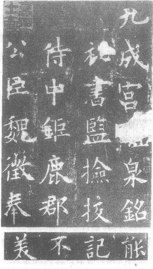 唐。刻石。唐贞观六年(即公元632年)四月刻。据王昶《金石萃编》载: “碑高七尺四寸,宽三尺六寸。”现藏陕西省西安麟游。欧阳询(见《欧阳询行书仲尼梦奠帖》条目)书。九成宫即隋之仁寿宫,唐太宗在此避暑,乏水,用杖棍导地,得水而甘,因此得名醴泉。此碑示称《九成宫醴泉铭》,由名臣魏征撰文,欧阳询书,记载了唐太宗在行宫——九成宫避暑的事。碑文共24行,行49字,额上有阳文篆书“九成宫醴泉铭”6字,碑左侧刻有宋元丰间(公元1076—1085年)各家题名,右侧刻有宋绍圣(公元1094—1098年)及明正德(公元1506—1521年)、嘉靖间(公元1522—1566年)各家题名。此碑是欧阳询晚年应诏之作,字体较大,字形方正,浑厚沉劲,虽为楷书,但又融有隶书笔意,撇、捺时用圆笔,弯勾则圆中有方,方中有圆,风骨内柔,意态饱满。由于此碑是欧体中最为严谨、险峭,笔笔具法则,字字有规矩,故受到后人的赞誉。学习欧阳体和研究欧体的人,也以此碑作为范本。明王世贞《弇州山人稿》云:“信本书太伤瘦俭,独《醴泉铭》遒劲之中不失婉润,尤为合尔。”《芳坚馆题跋》云:“《醴泉铭》高华浑朴,体方笔圆,此汉之分隶、魏晋之楷合并酝酿而成者。”此碑因年久腐蚀、磨损严重,现已失去其本来面目。其拓本很多,有“榷场本”、“界线本”、“锡山秦氏本”、“吴门蒋氏本”等,又有缩临本数种。原刻以宋拓本最为珍贵,其中“栉”字和“重”未损。现北京图书馆、北京故宫博物院、北京市文管会、上海博物馆等有宋拓本10种之多。其中北京故宫博物院所藏的北宋拓本,曾归明驸马李琪,不仅笔墨丰腴,且字迹清晰,当为第一。文物出版社有影印本。