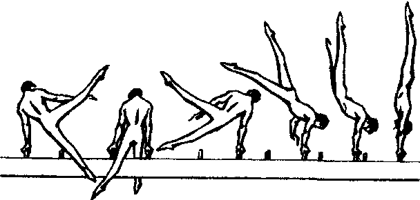 初学时可由教练员站在运动员身后,待交叉转体至单环分腿俯撑时,双手托扶运动员髋部,帮助完成倒立动作,以体会动作过程和用力顺序,然后可练习正交叉转体90°成单环分腿俯撑再下摆至骑撑,逐步提高分腿俯撑的高度,直至达到倒立位置。