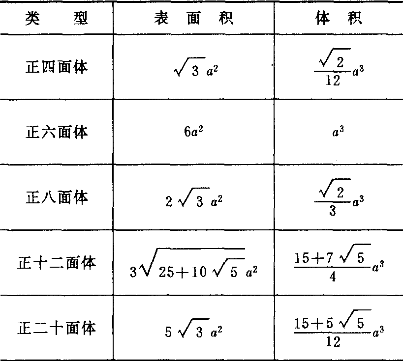 | 释义 | 正多面体的表面积和体积 正多面体的表面积和体积zhengduomianti de biaomianji he tiji设正多面体的棱长为a,则它的表面积和体积如下表所示: