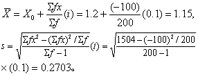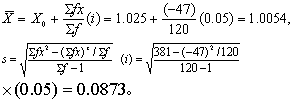 本资料经正态性检验服从正态分布,见条目“正态性检验”例2。并由该处表5第(1)~(5)栏得∑f=120,∑fx=-47,∑fx2=381,i=0.05,X0=1.025,故