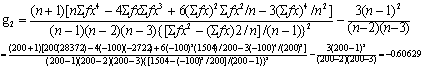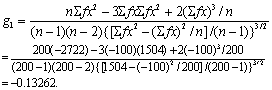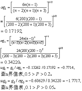 (1)此资料属偏态分布,如表3第(1)、(2)栏,故试用对数变换,并编制频数表。 观察值的最大值为60,lg60=1.78;最小值为3,lg3=0.48。对数全距为1.78-0.48=1.30,设计组段并编制频数表见表2。(2)用矩法作正态性检验。 H0: 总体服从对数正态分布, H1: 总体非对数正态分布。 α=0.05。 表2取缩简值见第(5)栏,则得n=200,∑fx=-100,∑fx2=1504,∑fx2 =-2722,∑fx4= 28372。