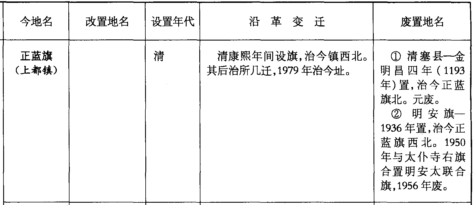 正蓝旗(上都镇)清清康熙年间设旗,治今镇西北。其后治所几迁,1979年治今址。❶ 清塞县—金明昌四年(1193年)置,治今正蓝旗北。元废。❷ 明安旗—1936年置,治今正蓝旗西北。1950年与太仆寺右旗合置明安太联合旗,1956年废。