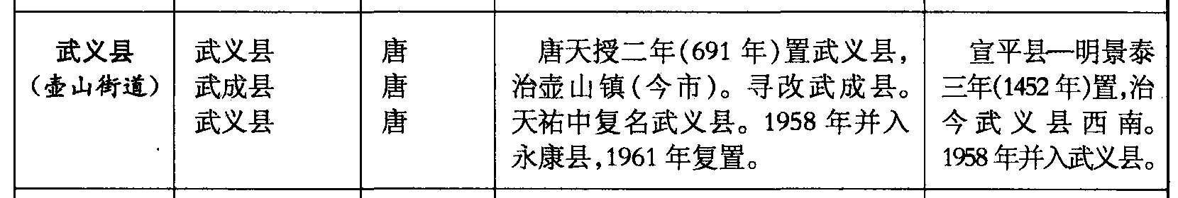 武义县(壶山街道)武义县武成县武义县唐唐唐唐天授二年(691年)置武义县,治壶山镇(今市)。寻改武成县。天祐中复名武义县。1958年并入永康县,1961年复置。宣平县—明景泰三年(1452年)置,治今武义县西南。1958年并入武义县。