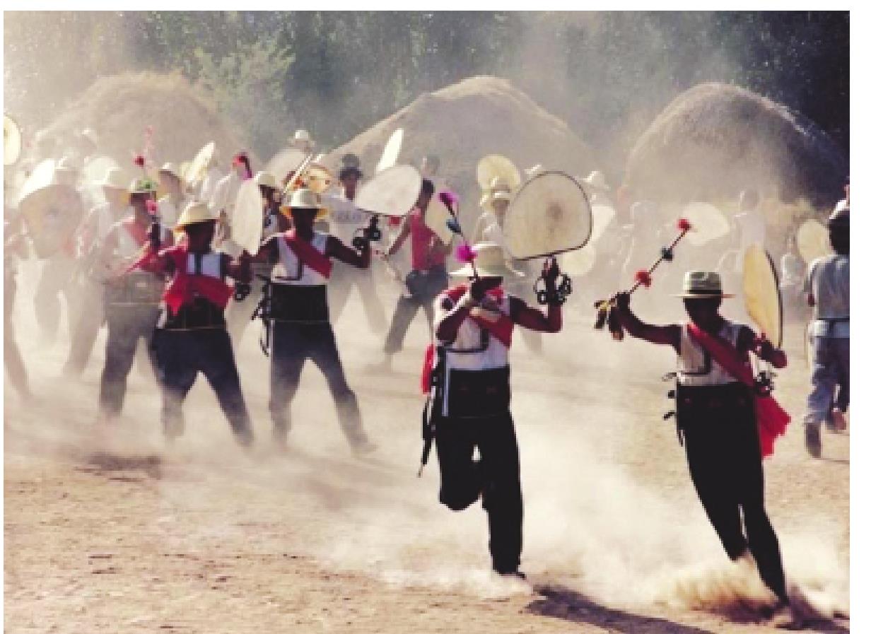 | 释义 | 武山旋鼓舞 武山旋鼓舞传统舞蹈。国家非物质文化遗产。旋鼓舞也叫扇鼓舞或羊皮鼓舞,是一种舞乐结合的群众性民间广场舞蹈艺术。代表地区有武山的滩歌镇、洛门百泉、龙台、山丹等镇村。最初的作用是牧童用来震慑狼群、减灾避害的活动方式,后来发展成为民间祭祀、祷告、祈助等宗教仪式。羊皮鼓为男性群体舞蹈,表演人数数十人或数百人上千人均可。演出方式以行进、圆场式为主。道具有羊皮鼓一面,鼓槌一只。鼓为单面鼓,状如团扇,以木或扁铁做框,上蒙羊皮,柄下置三孔佩九环,鼓时九环互触有声。鼓槌用羊皮或麻绳编成,状如秦剧中的马鞭,长约一尺有半,由鼓槌、鼓柄、槌穗(为红色)组成。动作有原地击、跑跳击、跑步击、吸腿击、蹉步击、下蹲击、翻身击、半蹲击、虎跳击、箭步击、互击 11 种。最精彩者为跑跳击、吸腿击、虎跳击。跑跳击,舞者左手持鼓于左胸前,右手握鼓槌击鼓,左脚向前跑跳一步,右脚抬起,左脚垫跳一步后,右脚落地跑跳一步,左脚抬起连续按一拍节奏反复。吸腿击,左手持鼓于左胸前,鼓面朝右,右手持鼓槌从右侧上方击鼓。一拍击鼓、二拍响铁环。左脚合第一拍脚尖着地,脚跟提高,右腿脚尖蹦直吸腿。第二拍脚跟落地、右腿还原。第三、四拍与第一、二拍做相反动作。虎跳击,左手持鼓,右手持鼓槌落地作翻虎跳后击鼓。表演时,舞者戴草帽,穿对襟上衣,内带绣花肚兜,外套白色马夹,腰系青色布带,下着青色或蓝色大裆裤,脚蹬麻鞋,鞋尖饰红色或青色穗子,左手持鼓右手握鼓槌和着鼓点在领舞者引领下或奔或突或旋或圆,忽左忽右,时缓时趋,形成旋场、旋蜗牛、旋八字、旋四角、剪子扣、旋麻花、开四门、太子游四门、白马分鬃、蛇蜕皮、钻口袋、蛇嗖道、蚰蜒出洞、二龙戏珠、钻花眼等 19 种队形。