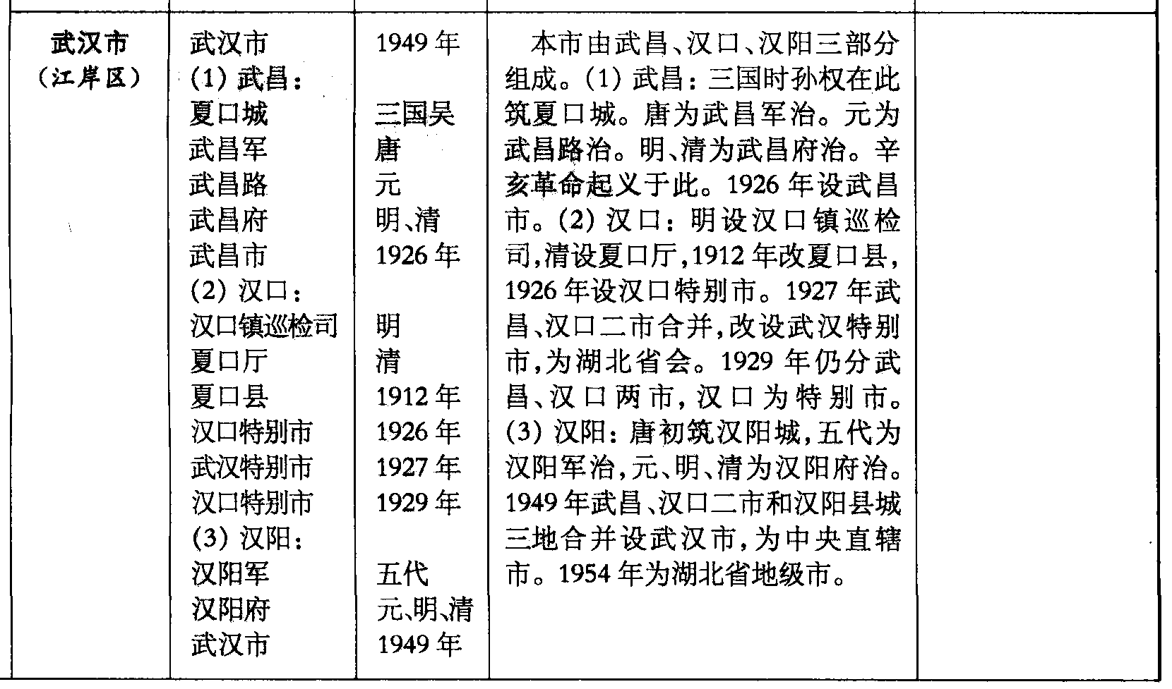 本市由武昌、汉口、汉阳三部分组成。(1)武昌:三国时孙权在此筑夏口城。唐为武昌军治。元为武昌路治。明、清为武昌府治。辛亥革命起义于此。1926年设武昌市。(2)汉口: 明设汉口镇巡检司,清设夏口厅,1912年改夏口县,1926年设汉口特别市。1927年武昌、汉口二市合并,改设武汉特别市,为湖北省会。1929年仍分武昌、汉口两市,汉口为特别市。(3)汉阳:唐初筑汉阳城,五代为汉阳军治,元、明、清为汉阳府治。1949年武昌、汉口二市和汉阳县城三地合并设武汉市,为中央直辖市。1954年为湖北省地级市。