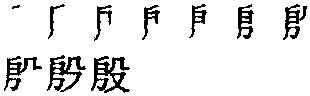 【提示】在异体字整理前,只有在读yīn,表示 “情意深厚” “热情而周到” 等义时,“慇” 是 “殷” 的异体; 用于其他音、义时,“殷” 没有异体。 , 起笔是撇, 不是点; 中间的横,宋体与左右两边相接,楷体与左边相接,与右边相离。右上的几,末笔不带钩,不要写成几。 *殷yān10画 殳部 暗红色: ~红。 另见yīn(476页)。