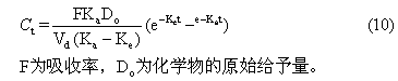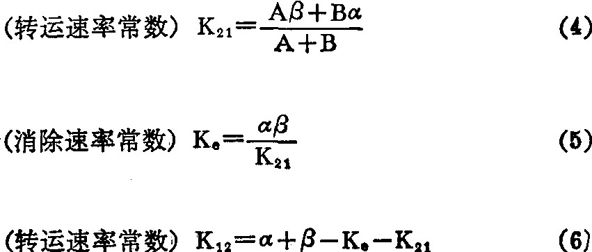 血浆中浓度或体内量与时间的函数关系模拟图 化学物入体的初期,分布与消除同时进行,主要反映化学物从中央室向周边室分布,称分布相,亦称快相,血中化学物浓度在半对数纸上呈直线下降; 待分布达到平衡后,血中浓度趋于缓慢下降,反映化学物自体内的消除,称消除相,又称慢相。将此β直线部分向纵轴延伸,所交纵轴的点为B值。将血中化学物实测值减去β线上同一时间各相应点的数值,其差值在同一半对数坐标纸上可得到另一条α直线,交于纵轴的点为A值。此直线主要反映药物向组织的分布。若化学物的消除过程中出现一个明显的慢相,提示重复接触时,有产生蓄积毒性的可能。 根据A,B,α,β各值,可按下式求出各速率常数。