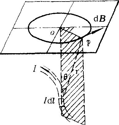 式中dB是电流元Idl在空间一点P产生的磁感应强度(见图1),γ是从电流元到P点的距离,γ是沿着矢径方向的单位矢。在国际单位制中,k=10-7特斯拉·米/安培。实用中将k换写为k=μ0/4π,μ0叫做真空磁导率,于是毕奥—萨伐尔定律又可写为 ![]() 式中(dl,r)为Idl与矢径之间的夹角。上式说明电流元在空间一点产生的磁场其大小与电流元到该点的距离的平方成反比,与电流元Idl和r间夹角的正弦的乘积成正比。dB的方向垂直于Idl与r组成的平面(图中阴影部分),指向是由Idl沿小于180°的角转向r时右手螺旋前进的方向。由毕—萨定律出发,再运用磁场叠加原理,可计算出任意电流元在空间某点的磁感应强度B为