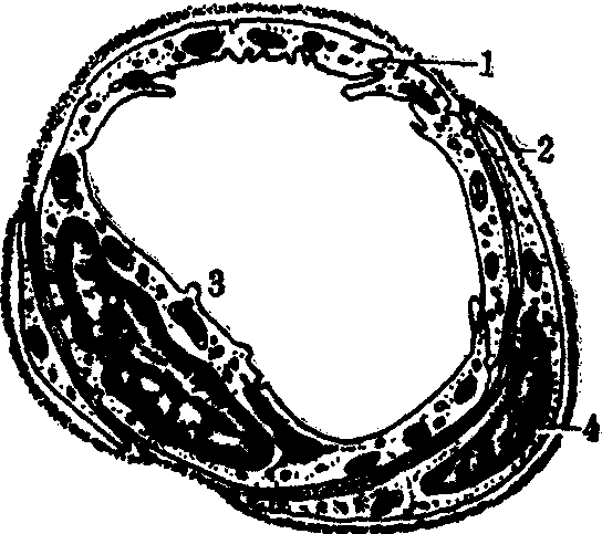 图1 连续毛细血管 1.细胞连接 2.基板 3.内皮细胞 4.周细胞