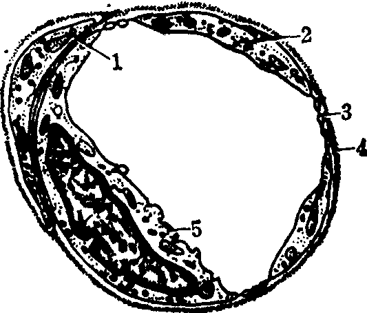 图2 有孔毛细血管 1.周细胞 2.细胞连接 3.窗孔 4.基板 5.内皮细胞 生理学对毛细血管通透性的研究提示,毛细血管壁有可供物质出入的孔,小孔直径约11nm,大孔直径约50~70nm。但对毛细血管的超微结构的研究,未能见管壁有相应大小的孔。电镜对示踪物透过毛细血管的观察表明,10~30nm的分子主要经有孔毛细血管的一部分窗孔通过,小于10nm的分子能由所有窗孔通过,窗孔的隔膜对大分子物质通过有限制作用。另外,2~30nm的分子也能由质膜小泡和小泡相连所成的通道中通过。对连续毛细血管的观察指示,大于10nm的分子只能由质膜小泡输送。故现倾向于认为质膜小泡相当于大孔。对小孔的见解不一,可能是细胞连接。但有人认为,质膜小泡也输送小分子物质,小泡的融合点和窗孔隔膜能限制大分子物质。细胞连接只允许2nm的分子通过。 ☚ 静脉 微血管 ☛ 毛细血管blood capillary |