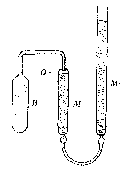 等体气体温度计:测温泡B中盛有一定质量的某种气体,通过毛细管与精密水银压力计相连,上下移动压力计的右管M′,使左管中的水银面始终停留在O处,以保持测温泡中气体的体积不变。测温泡B与0℃的系统达到热平衡时其压强为p0,B与100℃的系统达到热平衡时其压强为p1,B与温度为tv的待测系统达到热平衡时的压强为p,由气体体积保持不变,其压强随温度线性变化的性质,有tv/100=p-p0/p1-p0,由所测得的压强值,可以求得待测系统的温度tv。实际测量时还要考虑到各种误差,如测温泡及毛细管的体积会随温度变化,毛细管中的气体与测温泡中气体的温度不完全相同等,因此对测量结果需进行修正。等体气体温度计的灵敏度高,实现起来比较容易,并能保证较高的准确度,因此国内外常用它来复现热力学温标。1968年国际实用温标的大多数固定点的指定温度值都是根据这种温度计测定的结果定义的,它在温标的建立及研究中起着重要的作用,很少用于一般的温度测量。