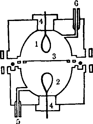 正比计数管在一次计数后间隔1~2μs即能记录下一个入射粒子。正比计数管的分辨时间比G-M计数管短得多,这是它的一个优点。 流气式2π正比计数管中央阳极是一根极细的金属丝,它绕成半圆环固定在金属棒上,外壳即为阴极。使用时将甲烷或氩-甲烷混合气体由贮气钢瓶缓缓通入计数管,压力略高于一个大气压。测量样品可直接放在计数管内。有些管子设有薄窗,材料为铝或镀有金属层的塑料薄膜。这类计数管几何条件为2π,故常称为2π计数管,常用于α放射源的绝对活度测量或软β样品的相对测量。 有些流气式正比计数管是将上述2π计数管组合起来(见图6、7),测量样品铺在镀金有机薄膜上,插入中间,这样,几何条件为4π,称为流气式4π正比计数管,多用于β源的绝对活度测量。 具有多根阳极丝的正比计数器称多丝正比计数室,在医学上可用作显象装置的探测器(参见“多丝正比探测器”条)。