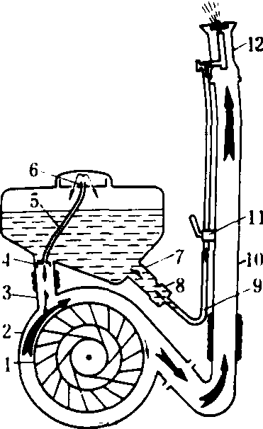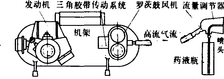 图1 弥雾工作原理 1.风机叶轮; 2.风机壳;3. 出风筒; 4.进气塞;5.进气管;6.过滤网; 7.药液箱;8. 出水塞;9.输液管;10.喷管;11.开关;12. 喷头 背负式机动气力喷雾机 主要由发动机、离心风机、药箱、喷射部件和机架等组成。其弥雾工作原理如图1所示。风机叶轮在发动机带动下产生高速气流,其中大部分高速气流经风机出口进入喷管。一部分气流产生动压经出风箱、进气塞、进气管、过滤网组合的出气口转变为静压进入药箱,使药筒内有一定的压力。药液经过粉门、出水塞、开关,从喷嘴流出。流出的药液在高速气流的冲击下,破碎成细小的雾滴从喷头喷至目标物。此机结构较简单,重量较轻。整个机具背负在操作人员的背后,移动方便灵活,适应性广。它可以综合利用,可作低量、微量喷雾和喷粉,改装后可喷烟、喷火和喷洒颗粒剂等作业。 手提式气力喷雾机 图2为美国生产的HCSI-2AA型手提式气力喷雾机。其工作原理是罗茨鼓风机产生高速气流进入喷头,在吸液口形成负压,药液从药液瓶中吸入喷头,在高速气流的冲击下雾化成细小的雾滴从喷头喷至目标物。发动机采用二冲程1.5千瓦汽油发动机,额定转速为6 000转/分。发动机输出轴通过三角胶带驱动罗茨鼓风机工作。罗茨鼓风机主要由两个“8”字形的活塞和壳体等零件组成,具有较高的风压,保证了喷头雾化所需的风量和风压。喷头由喷头片、喷头座、导流盘和流量调节器组成。流量调节器有4个流量调节孔,孔径分别为0.3、0.4、0.65和1.2毫米。流量调节操作比较方便。喷头和罗茨鼓风机之间采用蛇形管连接。药液瓶为标有刻度的透明塑料瓶,便于观察喷药量的变化。药液瓶容量为1升。