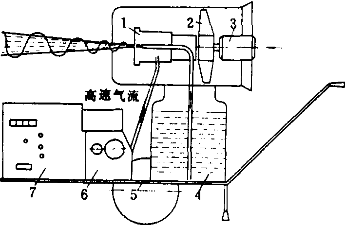 图2 手提式气力喷雾机结构示意图 常温烟雾机 日本生产的常温烟雾机,主要用于防治温室内作物病虫害。其主要优点是:雾滴体积中值直径很小,一般为2~5微米,雾滴输送和扩散性强,喷洒均匀;用水量少;能使用各种农药如水剂、乳剂、油剂、液剂等;能实现无人作业,节省劳力,操作者不受农药污染;能在温室内消毒等。此机结构如图3。空气压缩机为无油式压缩机,可由电机或风冷单缸四冲程汽油机驱动,最大压力为500千帕,转速为1 400~1 800转/分。喷头为双流体常温烟雾喷头,能产生细小的雾滴,常用压力为100~140千帕,常用喷量为40~75厘米3/分。轴流风机转速为1 400~1 740转/分,风量为30~52米3/分。药箱容量为7升。空气压缩机产生的气流以340米/秒的速度进入喷头,高速气流将药液雾化成极细的雾滴,通过轴流风机使整个温室内形成强烈的空气对流,将雾滴分布到温室的各个部位。