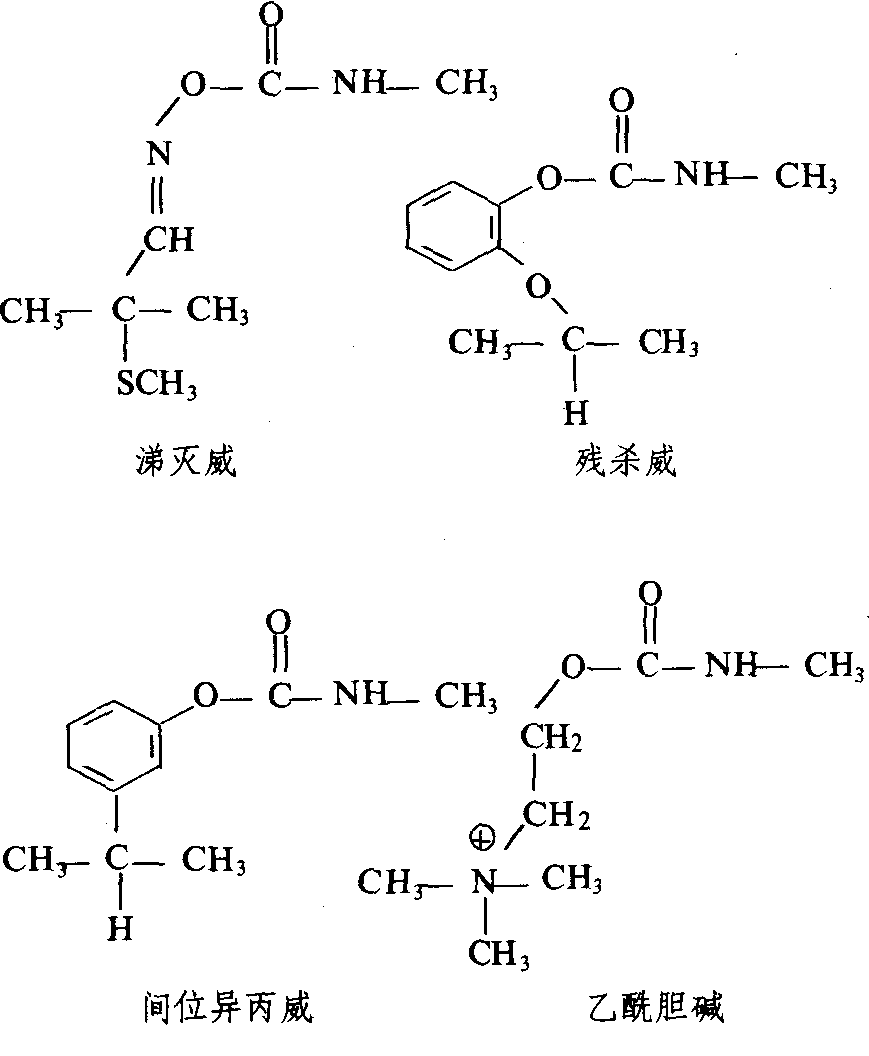 图1 氨基甲酸酯对乙酰胆碱酯酶的抑制反应 氨基甲酸酯的氨基甲酰化酶的分解过程比有机磷酸酯的磷酰化酶的分解快。以化合物的一般半恢复时间(恢复为乙酰胆碱酯酶)来衡量,氨基甲酸酯的半恢复时间约20~60分钟,不同结构的氨基甲酸酯半恢复时间顺序为二甲基氨基甲酸酯>甲基氨基甲酸酯>氨基甲酸酯,相应的全恢复时间长达几天。有机磷酸酯的半恢复时间比较长,一般为80~500分钟。其中异丙基磷酰化酶则不能恢复,相应的全恢复时间长达几个月。影响因素 有机磷酸酯杀虫剂抑制酶的能力,主要依赖于自身的反应性;氨基甲酸酯对酶的抑制能力则决定于其自身的化学结构和酶的特性两方面因素,即化合物分子与酶的活性部位的亲合性以及酶本身的性质。对乙酰胆碱酯酶具有强抑制作用的氨基甲酸酯化合物,往往是结构上类似乙酰胆碱酯酶底物(如乙酰胆碱)的那些化合物,如涕灭威、残杀威和间位异丙威等(图2)。能有效抑制乙酰胆碱酯酶的这类化合物大多具有N-甲基氨基甲酸酯 结构。