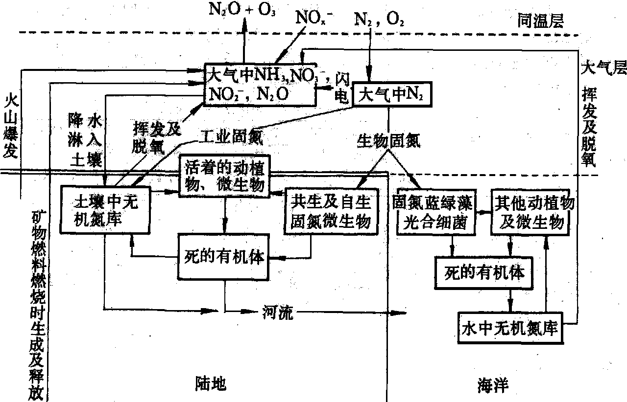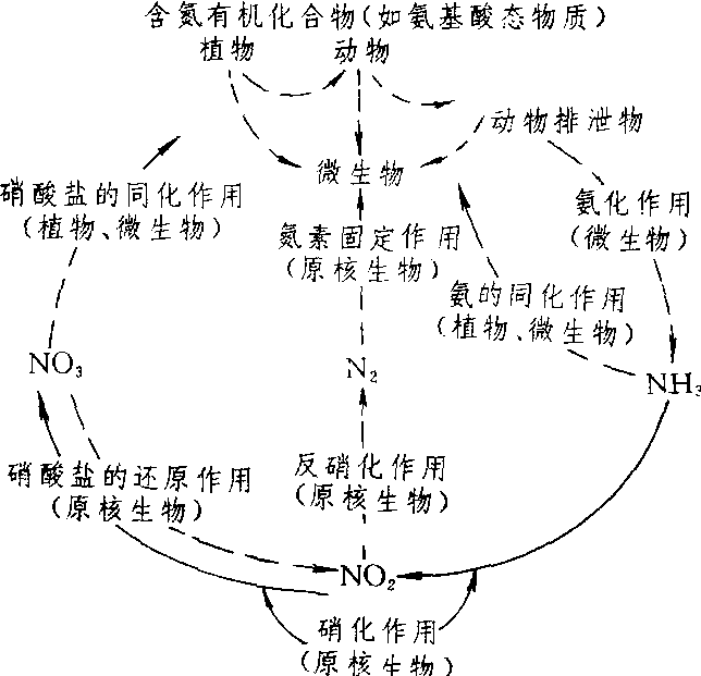 在全球的植物生物量中,只有3~10%的氮素是直接由固定的分子态氮提供,而90~97%是来自再循环的氮素,因此,增加氮素在生物库与土壤库之间的循环数量,调节循环速率和减少氮素在土壤中的损失,可使农业获得更多的、比较廉价的氮素。轮荒休闲制、有豆科作物参与的作物轮作制,是利用天然植被或人工栽种豆科植物积累氮素; 农林牧渔结构的合理安排以及其他农业措施,其目的也是使生物库与土壤库中的氮素贮存增多,耗损减少。工业合成氮的迅速增长使土壤库与生物库获得了大量氮素来源,使农业生产出现了新的水平。但由于人类对氮循环的干预缺乏全面认识与对策,也出现了许多新的农业问题和环境问题。世界生物固氮与工业固氮量1950年为100:9.6,而目前将出现工业固氮超过生物固氮的局面。过量无机态氮的施用,使肥效递减。据联合国粮农组织的资料,世界谷物增长的化肥效应明显下降,1950年前后1吨氮肥增产14.8吨谷物,1960年前后平均增产11.5吨,1970年前后平均增产8.3吨,1980年前后平均增产5.8吨;蔬菜中硝酸盐积累过高; 大量未被生物利用的硝酸盐进入河流和地下水,污染水源; 硝化过程中以及矿物燃料燃烧时生成的氮的氧化物,污染大气,破坏臭氧层,引起紫外线辐射的危害。因此,为了发展农业和保护环境,需要建立氮循环的合理平衡。 氮循环nitrogen cycle自然界的氮以分子态氮、有机态氮化物和无机态氮化物相互转化的过程。可用下图表示。