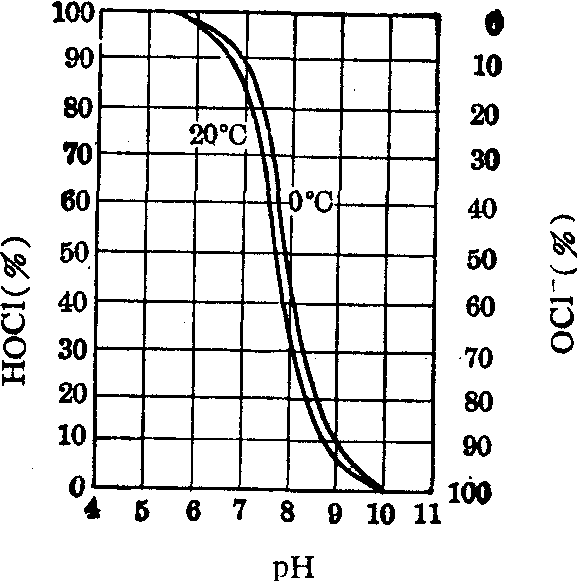 水中HOCl和OCl-的分配率主要决定于水的pH值(图1)。在常温和pH<5.0时,100%的次氯酸呈HOCl形式存在于水中;随着pH值的增高,HOCl逐渐减少而OCl-离子逐渐增多。当pH>10时,HOCl几乎全部离解成OCl-离子。OCl-也有杀菌能力,但因细菌带负电荷,故OCl-不易接近细菌,难以穿透细菌细胞壁,因而OCl-杀菌能力较弱。据实验,OCl-对大肠杆菌的杀菌效率仅为HOCl的1/80,OCl-对阿米巴包囊的杀灭效率仅为HOCl的1/300。 除HOCl外,能用于水消毒的一些含有效氯化合物还有: 漂白粉,分子式简写为Ca (OCl) Cl、漂粉精Ca (OCl) 2、氯胺包括一氯胺NH2Cl和二氯胺NHCl2等。