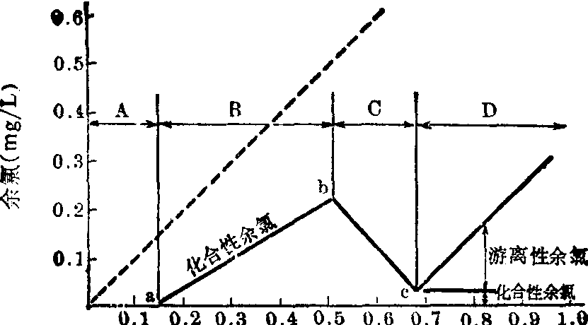 这时一部分一氯胺形成二氯胺,后者杀菌作用较一氯胺强,但因二氯胺具有臭味,故饮水氯胺消毒法采用的氯与氨氮重量比,应小于5:1。 (3) 折点氯消毒法: 当加氯量与氨氮重量比约为10:1时,化合性余氯最低,达图2C点,称为“折点”。采用的加氯量与氨氮重量比大于10:1时,称为折点氯消毒。加氯量更高时,可使游离性余氯不断增多。因此法主要靠游离性有效氯,故消毒作用迅速,且能消除臭味。但氯耗用量大,需通过实验求得折点加氯量。如果水中存在有机氮,则折点就不明显。加氯量超过折点时,水中可能出现一部分无杀菌作用的三氯胺: