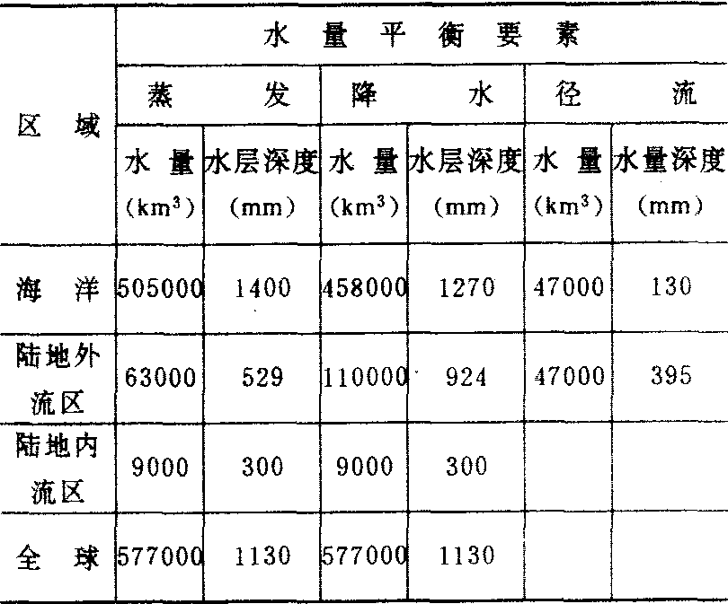 内流区并不是没有径流产生,因为内流区径流不注入海洋,最终也消耗于蒸发。地球上水量平衡要素有关数值见表: 地球上水量平衡要素概值