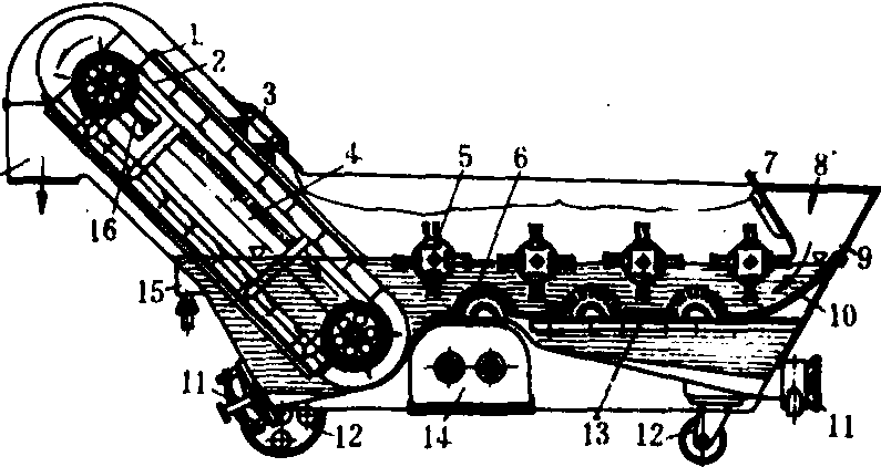 图1 刷式水果清洗机工作原理 1.挡果板; 2.输送带; 3.清洁水喷头; 4.输送带支架;5.旋转刷; 6.固定半刷; 7、10、13.导向板; 8.水果进口;9.水槽; 11.排污口; 12.轮子; 14.驱动装置; 15.水位调节器; 16.张紧装置; 17.水果出口 分选设备 根据生产工艺要求对水果进行分选的设备。有振动筛、浮选槽、绳索分选机、辊式分选机和滚筒式分选机等。可按水果个体尺寸进行分选,如需按颜色、成熟度或损害程度来剔除不符合加工要求的水果,只能在输送带上或捡选台上用手工进行挑选。五级水果绳索分选机的主体是倾斜放置的绳索床。绳索与水果运动方向平行配置,并按不同的绳索间距分成四段。由进入端至出口端逐段加大。水果在沿床面滚动过程中按尺寸大小依次落到绳索床下面的托板上,分别滚向各自的出口,最大的一级水果则由床面的一端滚出。由于绳索是柔性物体,所以这类机械对水果造成的机械损伤较小。 水果除核机 有多种型式。体积较大的核果类水果如桃、杏、李等的除核,常用剖分式除核机,它的主要工作部件是剖分刀,把水果剖分成两半。柔软而多果肉的小型核果如樱桃等的除核,常用推杆—支承窝板式除核机,它的工作步骤是:把水果铺放在支承窝板的半球形窝孔中,然后降下除核推杆,将果核经支承窝板的小孔推入收集室中; 再翻转支承窝板,已除去果核的果肉就经出口离开除核机。有些除核机采用间歇运动的旋转滚筒,滚筒表面配置支承窝,水果经输入装置和分配装置被铺放在支承窝上; 当水果运动到滚筒上方时,滚筒停止转动,推杆降下除核;滚筒继续旋转,果肉经出口离开除核机。这类机器除核效率高,但果肉损失率也比较高。 水果去皮机 常用的有碱液去皮机和干式去皮机。在碱液去皮机中有一条回转输送装置。剖分去核的水果(如桃子)切面朝下放置在输送带上,运动到预热区受到蒸汽的喷淋预热,继续前进到淋碱区,受到高温稀碱液喷淋腐蚀,再行进到冲洗区,受到高压冷水喷射,果皮被冲去,果肉受冷却。这种去皮机效率比较高,但用水量大,并且污染环境。干式去皮机(见薯类加工机械)适合于桃、杏、巴梨、苹果等水果的去皮作业。水果先经碱液处理,表皮已松软,然后进入干式去皮机中。在重力作用下向下移动,将橡胶圆盘压弯,在水果和圆盘表面之间形成接触面。由于圆盘转速大于水果下降速度,产生相对运动而摩擦去皮,去皮水果从出口卸出。干式去皮机用水量较小,但只适用于硬果肉的水果。 水果打浆机 把果皮和果核从果肉和果汁中分离出来的机械,主要用于果酱生产。它的工作部件为一个固定的圆筒筛,筒中心的一根转轴上按螺旋线排列2~4块刮板。刮板和圆筒筛都是用不锈钢制成的。工作时,水果进入圆筒筛,在旋转刮板产生的离心力和推力的作用下,随刮板在圆筒筛表面上螺旋地向出口端移动。在移动过程中,水果被擦碎,果肉和果汁从筛孔中流出筒外,果皮和果核从出口端排出。 水果破碎机 把水果破碎成符合加工要求的小块的机械。常用的有齿辊式、锤式、齿爪式、孔板式和齿刀式破碎机以及平板磨和齿盘磨等。常用于仁果类水果的齿刀式水果破碎机工作时,水果从进口处落入齿刀筒内。齿刀筒是一个下半部分镶嵌着许多齿形破碎刀的固定圆筒。圆筒内有 一根装有3块打击板的旋转轴。由于打击板的转速高达1600转/分,因此水果被高速甩向齿刀筒,被齿刀破碎成块,并从齿刀与齿刀筒之间的间隙中落出机外。更换不同齿形的刀片可以改变水果的破碎度。锤式水果破碎机是用高速旋转的锤片把水果抛向圆筒筛,被圆筒筛破碎后落出机外。齿辊式水果破碎机为两平行轴上的齿盘啮合时,把水果破碎。胶体磨式水果破碎机为水果落入两片旋转的磨盘间被磨碎。 水果预煮设备 用以破坏水果中酶的活性和排除水果中的水分与空气等的设备。常用的有夹层锅、链带式和螺旋式连续预煮设备等。夹层锅是最简单的水果预煮设备,把水果放入锅内,在锅底夹层中通人蒸汽,便能达到预煮的目的。 水果榨汁机 用压榨的方法把水果的液汁与固体物质分离的机械。常用的有裹包式、罐笼式、内气鼓式、活塞一带式、螺旋式、压气式和偏心式榨汁机等。裹包式榨汁机是把破碎后的水果(果浆泥)包裹在榨汁布中,码成一层层面积相同,厚度相似的挤压层,各层之间均用金属隔板隔开。然后施加外力(一般为液压力)挤压果浆泥,榨出果汁。裹包式榨汁机的榨汁压力可达2.5~3千帕,料层厚度为10~30毫米。它的出汁流程很短,压力很高,因此出汁率高,且结构比较简单,操作方便,但属间歇作业,自动化程度低。带式榨汁机(图2)主要工作部件是两根用聚酯材料制成的回转封闭式榨汁带。果浆泥从进料口进入水平放置的预排汁区,在重力作用下,大部分果汁在预排汁区经聚酯带被滤出。剩余的果浆泥经楔形开口进入截面逐渐变小的垂直排汁区、压纹滚筒榨汁区和由挤压滚轴组成的S形榨汁区,在运动过程中进行榨汁,残渣最后经出渣口排出机外。该机自动化程度高,出汁率较高,但成本高,保养较复杂。