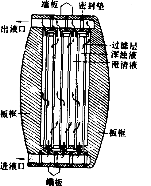 图2 带式榨汁机工作原理 1.进料口; 2.预排汁区;3.垂直排汁区; 4.压纹滚筒榨汁区;5.S形榨汁区; 6.出渣口 果汁、果酒过滤设备 用于清除果汁或果酒中的各种固体浑浊物的设备。常用的有板框式、硅藻土滚筒式、盘式硅藻土式、烛式、真空式、单室离心式、多室离心式、碟形离心式和螺旋离心式等过滤机。图3为板框式过滤机的工作原理图,浑浊果汁或果酒从进液口进入,被过滤层过滤,浑浊物留在机内,澄清果汁或果酒从出液口流出机外。常用的过滤层材料为石棉、珠光岩、硅藻土、天然纤维或它们的混合物。