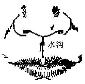 图42 水沟Shuigou系督脉上的一个针灸穴位。此穴在鼻柱下,人中沟的上三分之一处。施针时针向上斜刺0.2~0.3寸。主治休克、昏迷、窒息、呼吸衰竭、中暑、癔病、精神分裂症、急性腰扭伤、遗尿等。 水沟经穴名。别名“人中”、“鬼客厅”、“鬼市”。属督脉。位于鼻下,鼻唇沟的上1/3与中1/3交点处。主治:昏迷,晕厥,中暑,癫痫,惊风,鼻塞,鼻衄,面肿,齿痛,黄疸,消渴,挫闪腰痛等。向上斜刺0.3—0.5寸,或用指甲按掐。 水沟 水沟督脉穴。取穴:在鼻柱下人中沟的上三分之一处(见图2-1-10)。主治:昏迷、昏厥、癫痫、急惊风、牙关紧闭、暑病、挫闪腰痛、风水面肿。刺灸法: ☚ 神庭 上星 ☛ 水沟shuǐgōu经穴名。代号DU26。出《针灸甲乙经》。又名人中。属督脉。位于鼻下人中沟之上1/3 与中1/3交点处。主治休克、昏迷、晕厥、窒息、小儿惊风、癫痫、精神病、癔病、低血压、急性腰扭伤。向上斜刺0. 3 ~0. 5 寸, 或用指甲掐按。