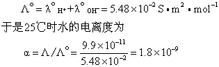 Kw称为水的离子积。 因一般蒸馏水中溶有空气中的CO2等物质,其电导率值约为10-2~10-3S·m-1。F.W.G.柯尔劳施在25℃时测定极纯的水的电导率,得 k=0.055×10-4 S·m-1 又1mol纯水的体积为1.802×10-5m3,则水的摩尔电导率为