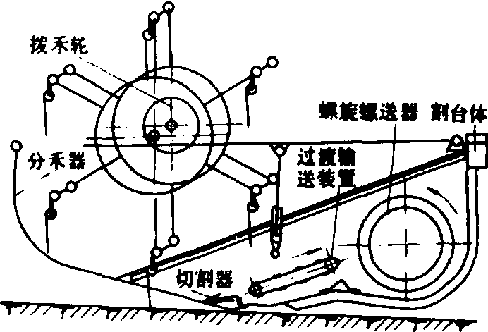 水稻割台rice-head attachment谷物联合收割机收获水稻的专用割台。可收获正常的和严重倒伏的水稻。 水稻割台的结构如图。过渡输送装置由主动辊、被动辊和输送带组成。拨禾轮和螺旋输送器基本上和谷物联合收割机相同。但为了加强对倒伏水稻的扶起能力和铺放时对作物的梳理作用,采用偏心拨禾轮,并在拨禾板上装有加强、加长的弹齿。螺旋输送器采用较高的圆周速度,并将左右两边螺旋适当延长至中间耙齿,其延长部分采用较大的螺距,以利作物均匀喂入谷物联合收割机的中间输送装置。
