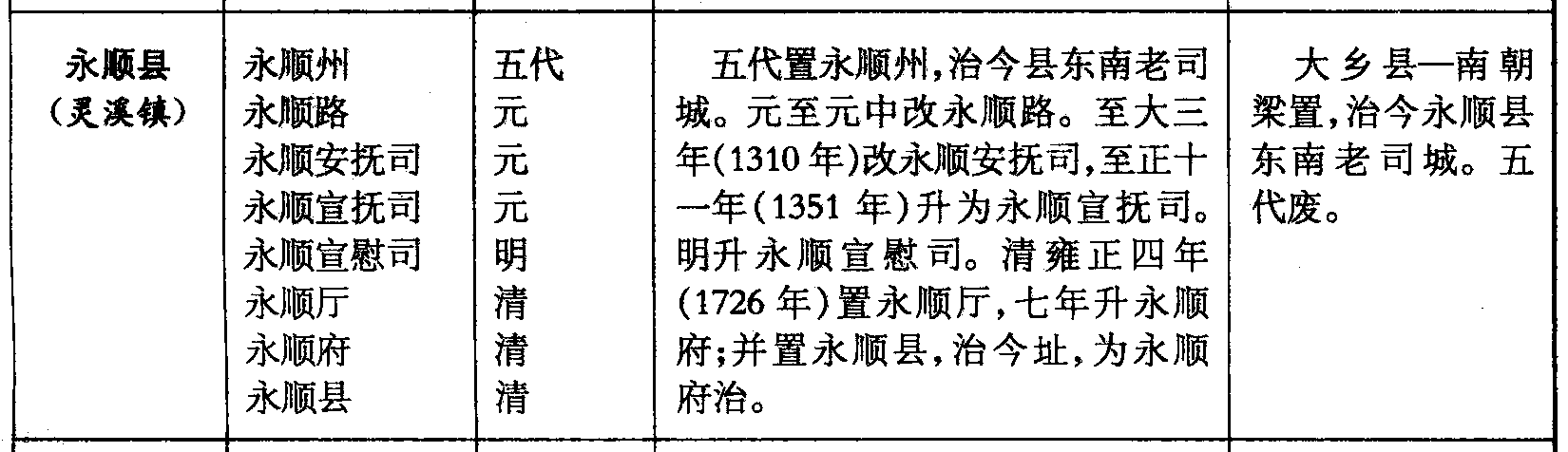 永顺县(灵溪镇)永顺州永顺路永顺安抚司永顺宣抚司永顺宣慰司永顺厅永顺府永顺县五代元元元明清清清五代置永顺州,治今县东南老司城。元至元中改永顺路。至大三年(1310年)改永顺安抚司,至正十一年(1351年)升为永顺宣抚司。明升永顺宣慰司。清雍正四年(1726年)置永顺厅,七年升永顺府;并置永顺县,治今址,为永顺府治。大乡县—南朝梁置,治今永顺县东南老司城。五代废。