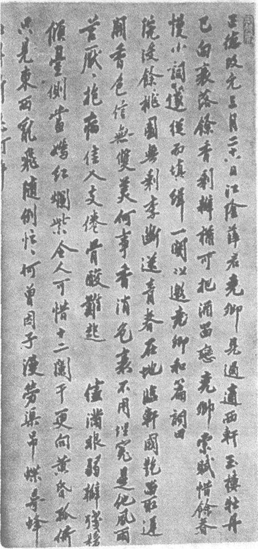 明。纸本。纵74厘米,横57厘米。江苏省南京博物院藏。沈周(宣德二年—正德四年,即公元1427—1509年),字启南,号石田、白石翁,世称“石田先生”。长洲(今江苏吴县)人,博览群书,一生隐居不仕,文学左氏,诗从白居易、苏轼、陆游。绘画尤工山水,得家传,后师宋元诸家,并融会贯通,自成一格,是明代四大家(沈周、祝允明、文徵明、唐寅)之首。书从黄庭坚。著有《石田集》、《客坐新闻》、《江南春词》、《石田诗抄》、《石田杂记》。《明史》卷二百九十八有传。此书是沈周81岁晚年之作,后钤有阳文<沈氏启南>、阴文<白石翁>两印。书笔力遒丽苍劲,笔画直挺而不枯燥,有清峻洒脱之感。
