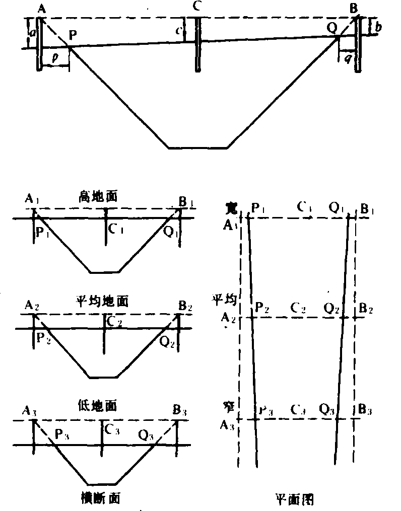 图1 明沟放线 再标出开口线P1、P2、P3和Q1、Q2、Q3。因PQ是原地面的边坡起始点,当地面高程较高时PQ距离较长;地面高程低时PQ距离较短,即原地面上开口宽度是随地形而变化的。明沟开挖方法,因所挖沟渠的大小和所配机械的不同而不同。农用铲运机开挖沟渠多采用环形路线作业的方法,如图2。先是由坡脚开始逐渐向土堤的中心线方向移动,当堆填的每一层土壤铺到填方的整个宽度时,则可用平土机或推土机将土壤加以平整和压实,达到设计标准为止。为使铲运机能正常均匀地装卸土壤,铲装路线应在直线地段进行。