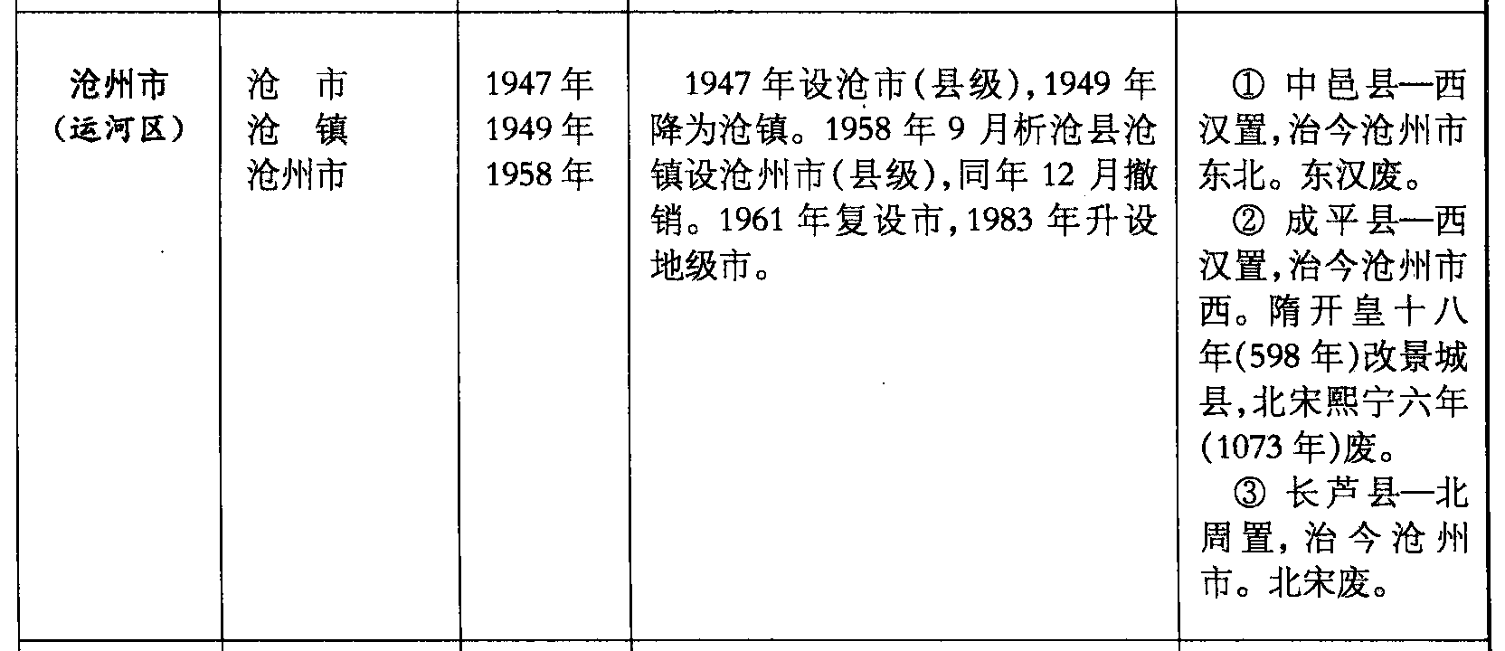 沧州市(运河区)沧市沧镇沧州市1947年1949年1958年1947年设沧市(县级),1949年降为沧镇。1958年9月析沧县沧镇设沧州市(县级),同年12月撤销。1961年复设市,1983年升设地级市。❶ 中邑县—西汉置,治今沧州市东北。东汉废。❷ 成平县—西汉置,治今沧州市西。隋开皇十八年(598年)改景城县,北宋熙宁六年(1073年)废。❸ 长芦县—北周置,治今沧州市。北宋废。