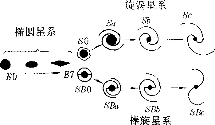 由表可知,沿哈勃分类的序列,椭圆星系一旋涡星系一不规则星系,有质量大小递减而温度由低渐高的趋势(星系的温度由全体成员的总辐射合成的复合光谱型可知)。温度上的差异反映了星系内星族成分的不同,也反映了星系内气体和尘埃含量的差异。为此人们曾认为,由椭圆星系到旋涡星系,从紧旋逐渐松旋以至成为不规则星系是一演化序列,也有人认为是以相反方向演化的,但其中许多现象却难以解释。所以现在许多人认为此三种类型间不存在演化关系,而只是由于初始条件不同造成的。到目前为止,星系演化仍是一个未解决的问题。