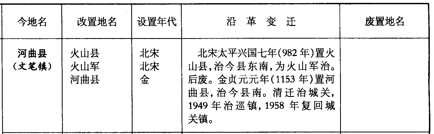 河曲县(文笔镇)火山县火山军河曲县北宋北宋金北宋太平兴国七年(982年)置火山县,治今县东南,为火山军治。后废。金贞元元年(1153年)置河曲县,治今县南。清迁治城关,1949年治巡镇,1958年复回城关镇。