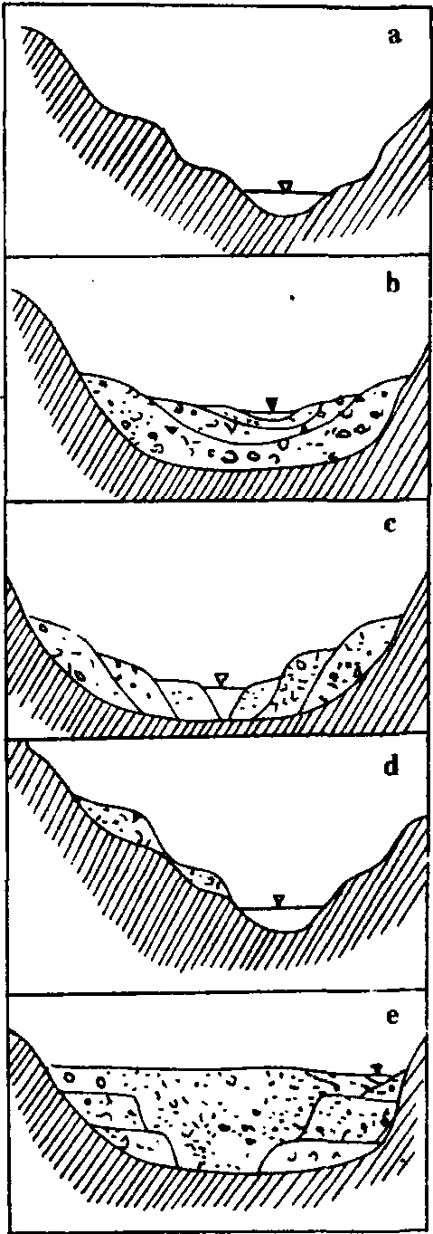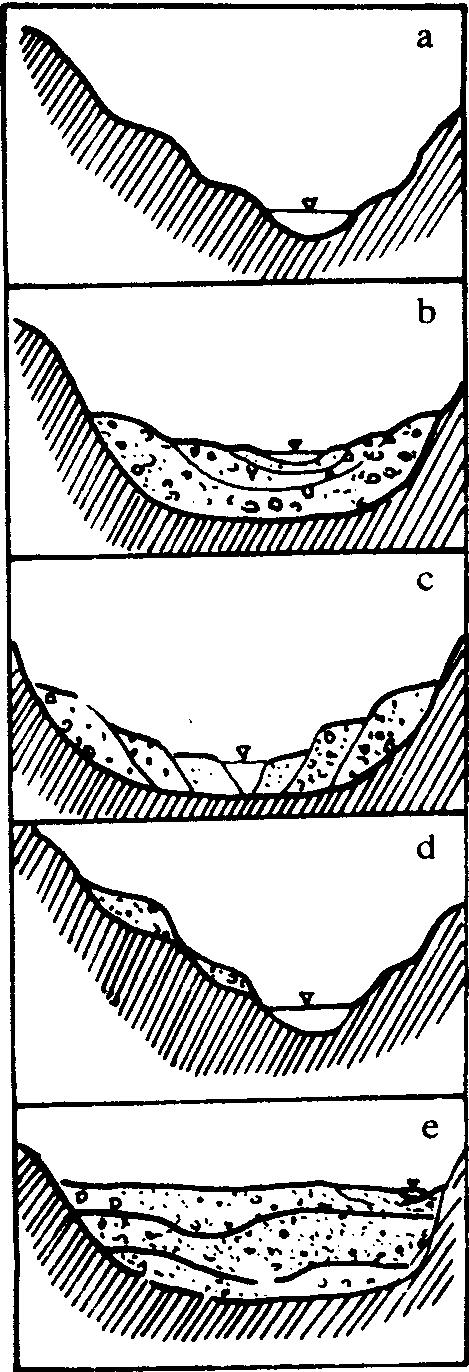 图2 阶地的类型 a.侵蚀阶地;b. 上叠阶地;c. 内叠阶地;d. 基座阶地;e.埋藏阶地 ☚ 河漫滩 洪积扇 ☛ 河流阶地由河流作用形成的,沿谷坡分布高出洪水位的阶梯状地貌。当地壳相对稳定,流水侧蚀和堆积作用,形成平坦的谷底和发育了河漫滩。后因地壳上升、基面下降或气候变化,促使河流下切,原已形成的平坦谷底和河漫滩相对抬高而成为阶地。 |